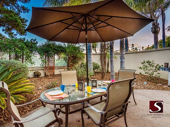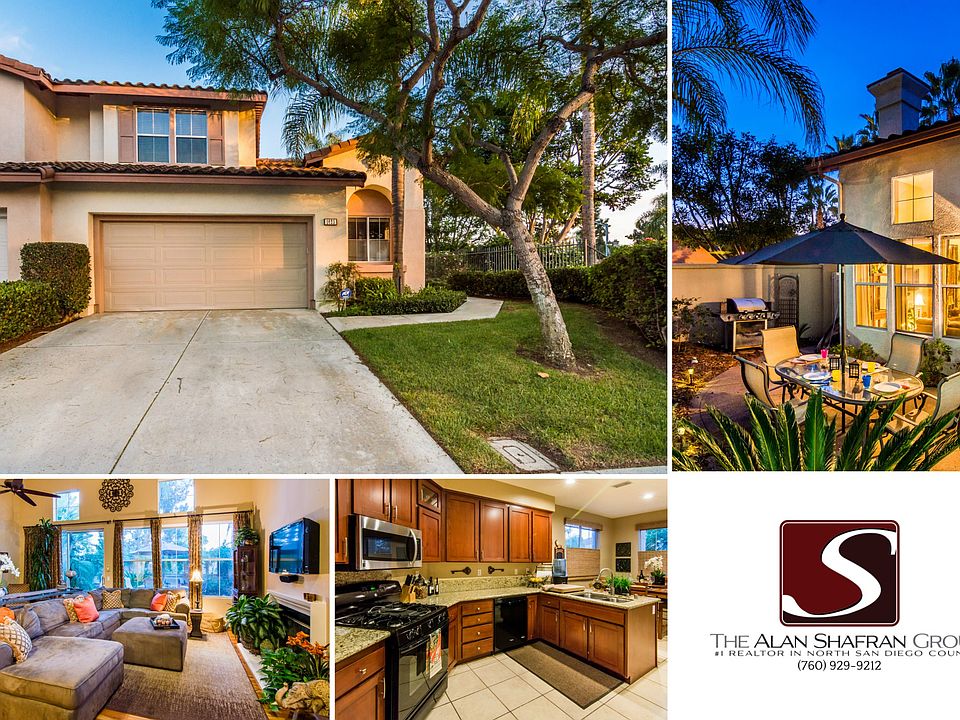 Located in the gated Sanderling community, this beautiful property is a corner unit with lots of privacy. Enter into the dramatically high-ceilinged living room, to be flooded with natural light. The living room features stunning Shaw hardwood floors, fireplace with mantle and sliders to the patio. Continue into the kitchen which has been remodeled with beautiful upgrades including granite counter tops, re-finished cabinetry, Haier wine refrigerator, new Kenmore microwave and new Whirlpool dishwasher. Off the kitchen is a casual eating area perfect for every day meals. The master suite is located on the first floor with carpet flooring, his & her sinks, and walk-in closet with professional custom built-ins ($3k+). The first floor also features a remodeled powder room with granite counter top, custom paint, and modern fixtures. Upstairs you will find the two bedrooms and a full bath. One bedroom has been updated with gorgeous crown molding and tall baseboards. The spacious backyard is great for entertaining and outdoor dining surrounded by mature landscape and new bark ground covering. Additional features include custom Hunter Douglas window coverings, ceiling fans in bedrooms and living room, pre-plumbed for central A/C, 2 car garage with ceiling storage, backyard automatic sprinkler system. Enjoy Sanderling amenities: two pools w/ spas and sand volleyball court. Amazing location walking distance to Aviara Oaks schools and short drive to golf course, Aviara Park Hyatt, and Paseo Real shopping center (Von's, Pharmaca, Cinepolis Luxury Cinemas, Tin Leaf Fresh Kitchen + many dining options).