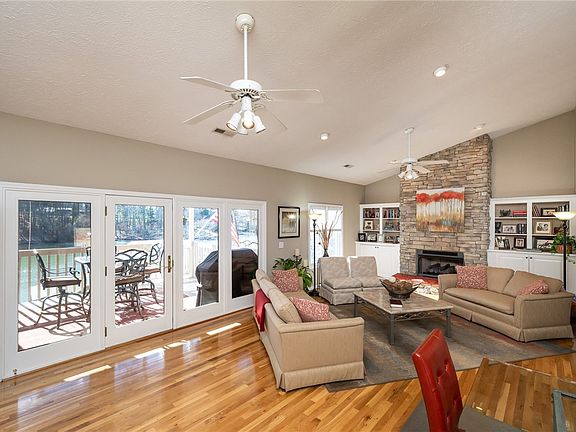Just off the kitchen area, step out into a large sunroom with roll-out windows all around and large enough to serve as a dining area with lake views. Access the covered deck from either the sunroom or the main living area. This is the perfect place to sip your morning coffee while watching the sun sparkle on the water or the deer splashing in the water across the cove. Late afternoon from this vantage brings remarkable sunsets.
