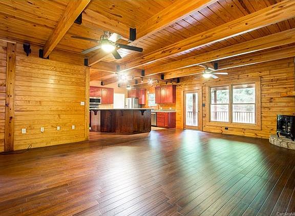 Stunning log 2 story home w/ soaring ceilings and open floor plan. Large kitchen w/island, main level master suite, covered deck for outdoor living and rocking chair porch. 2 bedrooms and Jack-and-Jill bath on 2nd level, with a large area on 2nd floor for family room or rec area. Brand new carpet installed and newly painted. NO HOA.