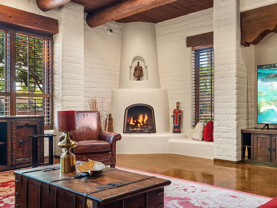 Discover unparalleled luxury and serene living in the exclusive Tinnin Farms community of Los Ranchos de Albuquerque. This exceptional 7,166-square-foot estate epitomizes the elegance and warmth of Santa Fe style, boasting incredible curb appeal and a magnificent presence in this verdant locale. The Santa Fe style is on display throughout the home, with iconic architectural details including rustic wood beam ceilings, classic diamond plaster walls and stained concrete floors with radiant heat that add a durable and stylish touch.The chef's kitchen features top-of-the-line amenities designed for both casual family meals and high-end entertaining.