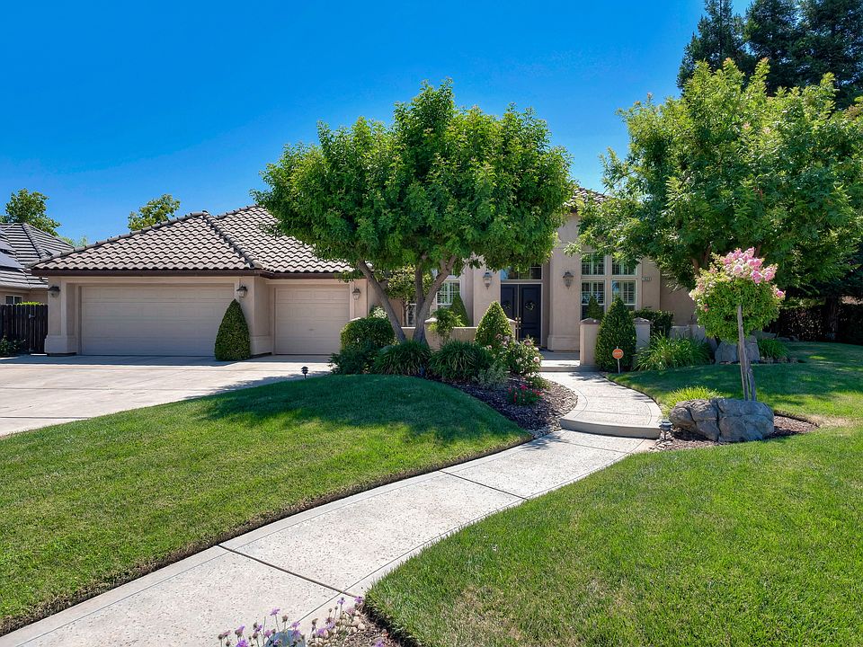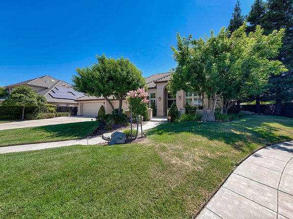 Lovely IMAGE home in exclusive Clovis neighborhood off of Deauville Circle on a large (.28 acre) lot in quiet cul-de-sac. 4 bedroom ( 4th bedroom in an en suite with its own dedicate bathroom currently being used as a den) 3 bath with 3 car garage. Fully landscaped front and back. This energy efficient home is single story with a nice open floor plan. Spacious gourmet kitchen with granite counter tops, center island with vegetable sink, double oven, gas stove, large pantry and water purifier. Beautiful plantation shutters, water softener system, ceiling fans, vaulted ceilings, canned lighting and crown moldings throughout. Wood flooring in entry, formal dining room, den and hallways. Great room has quality built in shelving and fireplace. Den with built in desk and shelving. The large master bedroom suite has a gas fireplace, french doors to backyard patio, and an enormous closet. Master bathroom includes relaxing Jacuzzi tub and shower with dual shower heads. Solar panels just $160/mo which saves nearly $250 on your electric bill on average every month! True Up has been $60 or less. West facing provides late afternoon and evening shade with covered back patio, exterior ceiling fans, pergola and fountain. Attached 3 car garage has cabinet shelving and access to attic with large storage area. Close to the community park and walking/ bike trails. Easy access to 168. Clovis Unified Schools: Dry Creek, Alta Sierra and Buchanan.