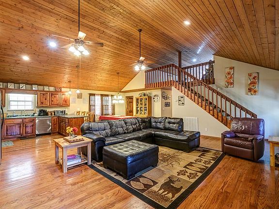 This is one SPACIOUS, CREEKSIDE home located close to town! Great home for a large family or friends and guests with 4 bedrooms, 3 1/2 bathrooms, Bonus Room and finished basement! Your main floor hosts your Great Room with wood vaulted ceiling, wood floor and a wood burning fireplace to warm the chilly mountain evenings. Your dining area next to your kitchen with SS and breakfast bar. Down the hall is your laundry room, guest bed & bath. Your Master Ensuite has French door access to your porch & a nice tile shower. Upstairs to your loft bonus room that makes a great office or craft room. Your basement has plenty of space with your Rec Room, 1/2 bath, 2 bedrooms that share a full bathroom. Outside is an outbuilding and your flowing CREEK. So much to enjoy here you'll never want to leave!