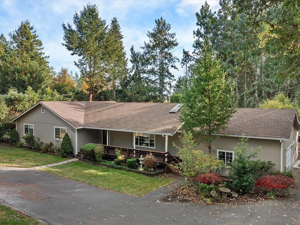 Towering redwoods and excellent privacy define this mostly single level home on a usable country acre. Large room sizes, custom details and quality finishes accent this spacious, comfortable home. Brand new interior paint and carpeting provide a clean, fresh ambiance. The kitchen, complete with stone tile countertops, beautiful wood cabinetry, and stainless steel appliances overlooks huge decks and the backyard with a forested backdrop. A massive brick wall, natural open wood ceilings, wood burning fireplace with insert, and sky-lite grace the large living room. Separate family room with wood floors, wainscoting, custom built-in cabinet, designer light fixture with matching sconces, and direct access to the backyard decks. The only space not on the main level is a large game room or second family room on a lower level also with direct exterior access. The primary bedroom boasts a walk-in closet, upgraded bathroom with dual vanities, tile and stone finishes, and French Doors leading to the backyard deck and spa. 2 additional large bedrooms and 2 additional full bathrooms (total of 3). The circular driveway, oversized garage, detached workshop with power, separate Tuff Shed for storage, and even a funky greenhouse provide attractive and functional appeal to your new country home.