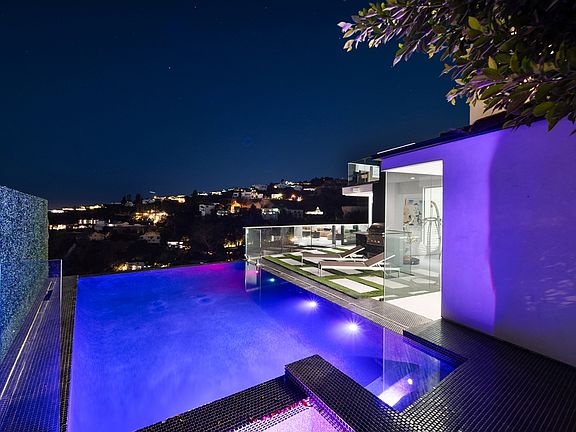 This home and all our listings are available immediately to assist displaced victims from the fires. Available NOW full-furnished and turnkey for short or long-term rentals! The epitome of Hollywood Hills luxury, this sleek modern home is a must-see opportunity in a spectacular location. This stud up rebuilt home is positioned to capture some of the most stunning views the Hollywood Hills has to offer. Fully furnished and exquisitely finished modern yet warm home built with entertainment and family in mind, this home is completely move-in ready. The home boasts 5 bedrooms, large den with balcony overlooking city views, bonus room which can be turned into a gym or office, 5 bathrooms, and world class amenities such as the Rolls Royce licensed theatre and garage. The main rooms open to vast outdoor entertaining terraces to enjoy the views and private pool and spa and gym area downstairs.