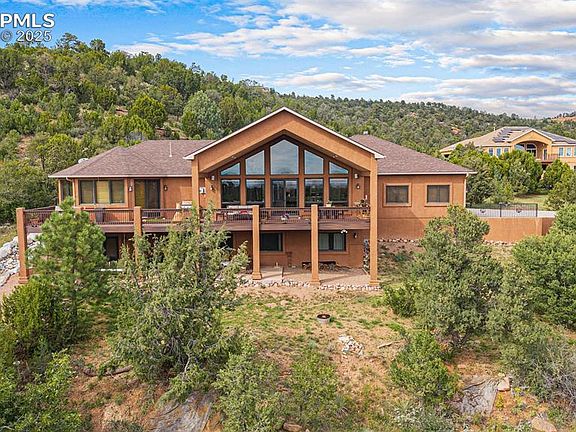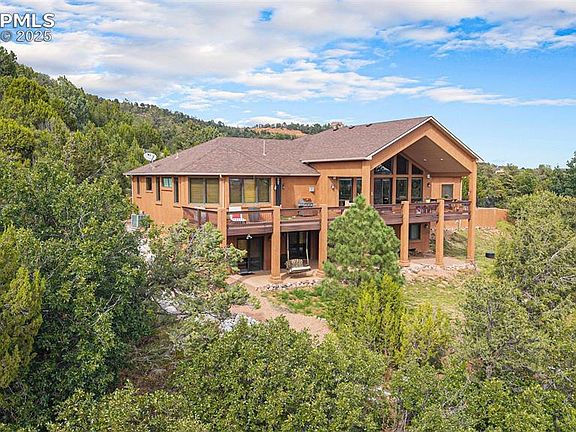 Serene living just minutes from COS in this stunning 2005 custom ranch. Set on 5 acres of pinon-covered land in the coveted Red Rock Valley, the home boasts sweeping views of the Spanish Peaks and a private setting within a quiet subdivision featuring its own fire department & community well. Warm stucco color & wood accents highlight the façade, with an asphalt driveway & concrete parking pad leading to the 3-car garage w/ workshop. Solar panels (2005) enhance energy efficiency while blending with the home’s design. Inside, vaulted ceilings & hardwood floors welcome you, while panoramic windows frame the covered Trex deck (2022)—perfect for entertaining or taking in sunrises & sunsets. The main floor offers formal dining, office, and a spacious living area w/ gas-log fireplace, stone accent wall (2016) & built-ins. The chef’s kitchen features quartz counters (2016), Sub-Zero, Hi-End appliances, pantry, breakfast bar & eat-in dining. Newer carpet and wood ceilings from the 2016 remodel add warmth and elegance throughout. The master suite includes a private sitting area, walk-out, updated closet (2016) & spa-inspired bath w/ tile, glass-block shower & fabulous clawfoot tub (Fun Fact- it is paintable too). The expansive basement provides 5 oversized bdrms, 2 full baths, a huge family room, laundry, exercise room w/ walk-out, and patio w/ abundant storage. The exercise room and one bedroom (currently a kitchenette) feature newer tile flooring (2016). Extra amenities include: 10-zone radiant hot water system, upstairs A/C, 2024 universal Tesla charger, 2021 roof, 2025 outdoor LED lighting, water softener, reverse osmosis drinking water filtration system, radon mitigation with dual monitors, 80-gallon water heater, whole-home surge protector, surround system in living room & master, & deck speakers. This home offers luxury, privacy & mountain views. Outdoor enthusiasts will enjoy Cheyenne Mountain State Park & Turkey Canyon Ranch, just 20 minutes from city conveniences.
