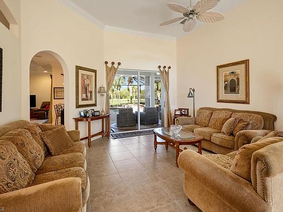 Extremely well maintained 4 bedroom 3 bath home with expansive view of the 9th fairway of beautiful Crown Colony. Large foyer opens to formal dining area with trey ceiling and living room with upgraded ceiling fan and sliding doors to lanai The eat in kitchen features an island with sink, stainless appliances, including wine refrigerator, granite counters and backsplash, lots of cabinet space and pantry. The family room has sliding doors to lanai, trey ceiling and upgraded ceiling fan. The large master bedroom, also has sliding glass doors opening to lanai, trey ceiling with upgraded fan, his/her master closets, tile shower, soaking tub and double sinks. The large,extended lanai with pavers, features a heated pool with raised spa, waterfall, and inside controls, outdoor granite top kitchen with built-in gas grill and refrigerator. Laundry room with lots of cabinet space and wash tub. The home has crown molding throughout most rooms, whole house electric and accordion storm shutters, new gutters, new pool pump, security system, plantation shutters in all bedrooms and baths. Golf Club membership optional.