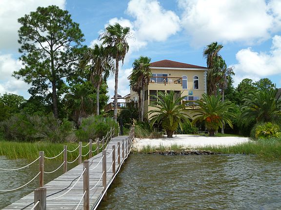 .84 Acre of land with 100 ft. frontage on Bon Secour Bay with 120 ft. Pier and 10 ft. x 32 ft. Dock and 8000 lb all aluminum boat lift. A second 12 ft. x 50 ft. dock is also included with the sale of the house. Living Room with Fire Place - 20 ft. ceiling - Tile Floor - 16 ft. x 17 ft. with 14 ft. x 16 ft. deck overlooking Bon Secour Bay. Formal Dining Room – Bamboo Floors - 13 ft. x 13 ft. with sliding door to open deck Kitchen with bar and pantry – Tile Floor - 11 ft. x 17 ft. adjacent to 12 ft. x 16 ft. screen porch overlooking the bay Informal dining area adjacent to kitchen – Tile Floor - 11ft. x 18 ft. with 14 ft. x 34 ft. deck overlooking bay Large Den with a sleeper sofa, kitchenette, and private bath serves as 4th bedroom for guests – Laminate Wood Flooring - 18 ft. x 19 ft. - with outside entrance. Laundry – Tile Floor - 5 ft. x 8 ft. Master Bedroom – Bamboo Floors – 16 ft. x 16 ft. with private 12 ft. x 16 ft. balcony overlooking Bon Secour Bay Master Bath with double vanities, shower, and Jacuzzi tub – Tile Floor – 18 ft. x 7 ft. Master Closet with custom organizers and hanging system - Laminate wood flooring - 8 ft. x 11 ft. Bedroom 2 - Laminate wood flooring – 13 ft. x 14 ft. – with private tiled bathroom and closet Bedroom 3 – Laminate wood flooring – 13 ft. x 13 ft. – with private tiled bathroom, closet and private outside entrance. 300 Sq. Ft. workshop/storage area at ground level with kitchenette and 1/2 bath – 12 ft. x 22 ft. on two different levels. Short term owner financing possible for qualified buyer.