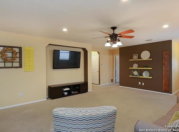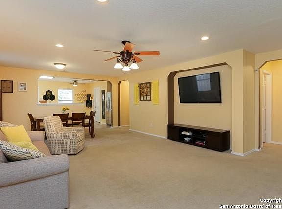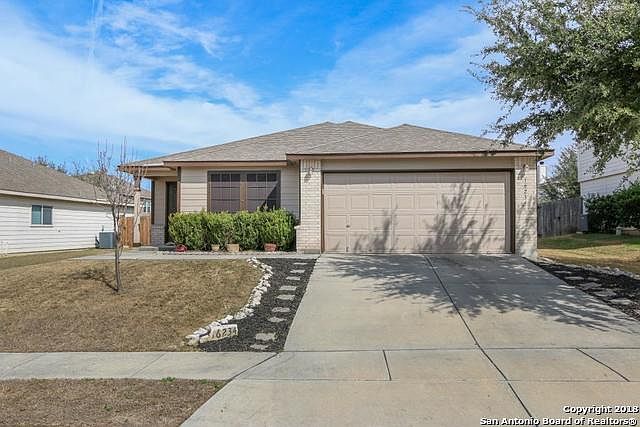 Lovely single story home in Retama Springs offers 3 bedrooms, 2 full bathrooms, fresh exterior paint & LED lighting. Nice open floor plan w/spacious combination living/dining area. Eat-in kitchen features stainless steel appliances, refinished cabinets, built-in microwave oven & smooth surface cook top on stove/range. Master suite features tray ceiling, walk-in closet & full bath w/separate vanities. Privacy fence & patio slab in the back yard w/lots of room for pets & kids to play. Convenient location.