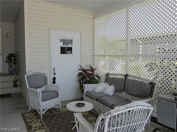 This lovely 3 bedroom, 2 bath home is on a perimeter lot in Lee Plantation. The lot is backed up by a wooded area. The owner recently made great use of this view by creating a wonderful patio area, fenced in and also covered by a power awning that automatically retracts if the wind gets too high. It has a new Trane A/C and a popular split floor plan. The lanai has drywall walls and ceiling and central air. This is a true gem. Come and see it soon! It won't last.