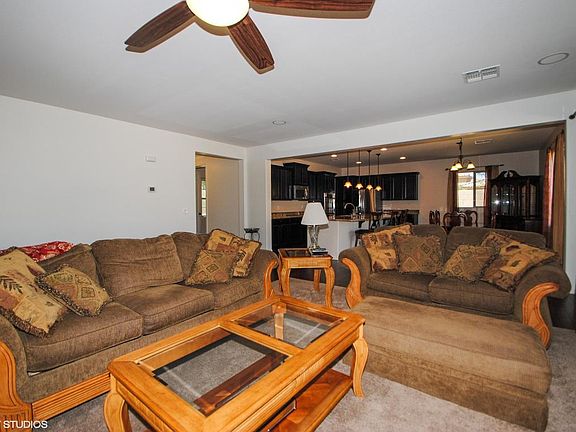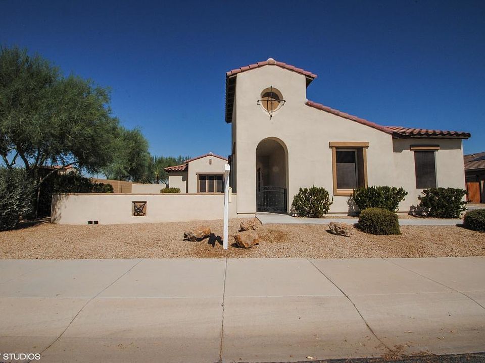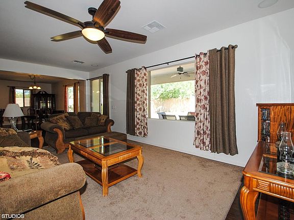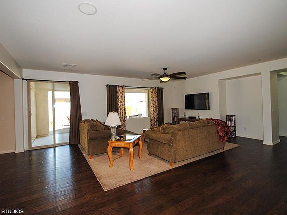 Upgrades galore & energy efficient! Owned solar with energy efficient HERS rating of 40! Situated on a large, corner lot across from a neighborhood park this 4 bedroom, 3.5 baths ''Ellie'' floorplan also includes a 4 car garage with extra-wide driveway. Enclosed front courtyard with flagstone with iron gate, spacious great room, and a private den. Hickory wood flooring throughout living areas. Chefs kitchen with granite counter tops, stainless steel appliances, double wall ovens, built in microwave, maple espresso cabinets with crown molding & rope insert, plus a walk-in pantry. Spacious master suite with jetted marble tub, large walk-in shower, dual sink raised vanity with granite, and a walk in closet. Three guest bedrooms and guest bath. One guest bedroom could be used as a 2nd master or mother-in-law suite as it has it's own private full bath. Additional upgrades with 8' interior doors, 14 SEER HVAC system, 5.1 surround sound in great room with Speakercraft 60R speakers, security system, sunscreens and front screened security door. Home has transferrable 2-10 Homebuyer's Warranty and a 10 year transferrable solar warranty. Relaxing backyard has a covered patio, desert landscape and a raised firepit. Wall-mounted TV brackets and hardware are not included. Come see today, this gorgeous home is sure to go fast!