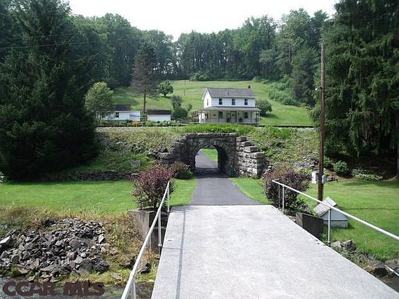 First Resale since 1875 on this historic home and setting overlooking Logan Branch. 5 private acres with riparian extra wide frontage access to Logan Stream, one of central PA's premier limestone feeder creeks to the renowned Spring Creek Trout Stream. Logan Branch is a native trout stream and your front yard is prime fishing site! One of central PA's historical keystone railroad bridges and in outstanding condition. The landscaping up to the lofty hillside setting of this 2-story country home is superb. Home is extra clean, nice hardwoods on 2nd floor and Living/Office/Entry on 1st Floor. Open kitchen plan and updated heating, new windows, new roof, and new electrical service. 2-bay extra-large garage/workshop with walk-up 2nd floor storage. 3 other storage/equipment sheds on the property with electric to all. Home is well above stream flooding level. Wrap-around new 9' covered porch provides great therapy of nature/water sounds. It's a gem from the past!