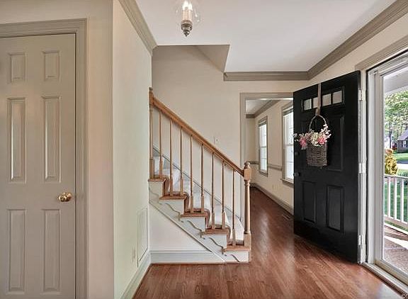 Come see this sought after Queensmill classic 4 bedroom, 2.5 bath lovely home on a .5 acre corner lot! There's time to relax on the large front porch as this well maintained home offers vinyl siding, replacement windows and a newly conditioned crawlspace. Beautifully refinished hardwood flooring in the foyer, dining and living rooms shine along with new paint and timeless chair railings and ceiling moldings. The just carpeted family room has an inviting wood burning fireplace and opens both to the deck and the open & oversized kitchen & breakfast area with a sunny bay window. Washer, dryer, stainless refrigerator & stainless dishwasher all convey. Direct garage access w/ 1st fl laundry/ mud room. The upstairs features a master bedroom with en suite bath and a large walk-in closet plus two additional bedrooms and a 23' by 15' foot 4th bedroom/ media room waiting for your ideas! Well loved home in a convenient and popular neighborhood. Super location and award winning schools. One year AHS home warranty too!