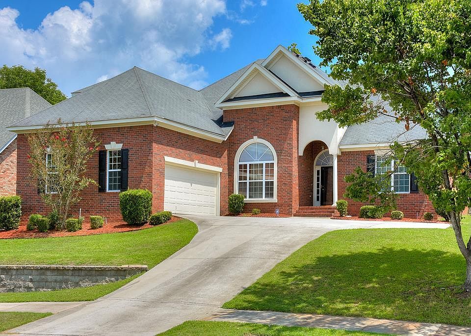 Evans all brick 1.5 story home with 4 bedrooms, 3 full bathrooms, and 1 half bath. No carpet on the entire main level of this home, carpet only located upstairs! Newly installed hardwood floors extend throughout most of the home to include master bedroom, addl bedrooms, great room, and formal dining room. Tile floors in Kitchen, breakfast room, bathrooms, and laundry room. Kitchen features beautiful granite counter tops with breakfast bar, tile backsplash and upgraded stainless steel appliances. Large open floor plan with tall ceilings, fireplace, split bedrooms, and large master bedroom with a huge walk in closet! Master bath has double sinks, tile flooring, garden tub, and separate shower. Upstairs you will find a large private entertainment space great for use as a theater room, gym, or den. Upstairs also has walk in storage spaces and plenty of attic space Backyard features a covered back porch. Neighborhood amenities - Pool, clubhouse, sidewalks, street lights.