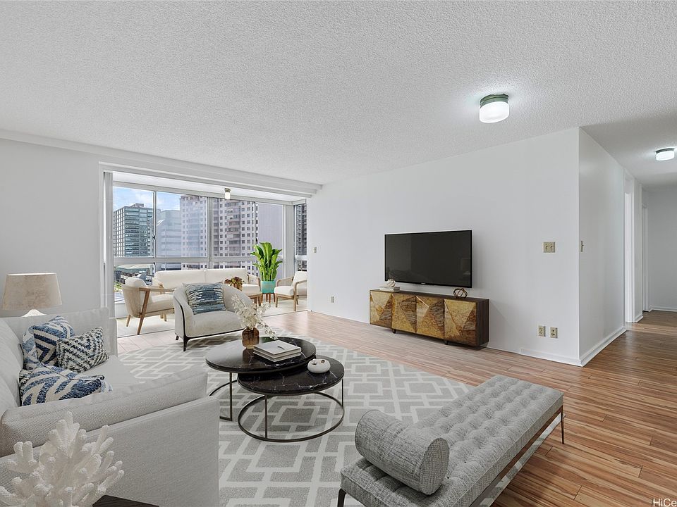 This is the best large 3-bedroom, 2-bath remodeled value in a well-maintained sleeper building in a central location next to Don Quijote. The unit has a new kitchen, baths, flooring, and paint. All the appliances and water heater have been replaced. A legal, permitted new full-size washer/dryer was installed. The lanai off the living room has been enclosed to create a large living space. Another huge open lanai is off the primary bedroom. This condo feels like a house in the sky with a peek-a-boo ocean view.