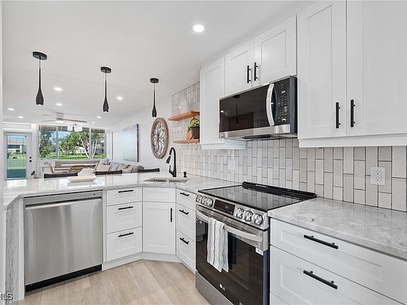 Completely updated unit, and nicely furnished for a 4 month or up to an annual lease available. This is a 2 bedrooms 1 bathroom first floor unit. Luxury Vinyl Flooring throughout the condo. Kitchen has white shaker cabinets with plenty of storage. New Stain-less Steel appliances, refrigerator has water as you open the door. USB ports in two locations for charging your electronic devised. Bathroom has a walk-in level shower with a built-in seat, linear drain and seamless glass doors. In the primary Bedroom is a king size bed and double custom closets. The guest bedroom has twin beds for your visitors during your stay. Seven Lakes is a 55+ community. All amenities are available to the tenants. Two people have unlimited golf access with no fees. There are 6 clay Tennis Courts, Pickle Ball Courts, Shuffleboard, Bocce Ball, 6 Heated Pools for our outdoor activities. Exercise Room, Painting/Pottery room, Billiards, Wood Shop, Card Games, On-Site Restaurant, Auditorium that hosts Dinners and Dances along with other Entertainment. Seven Lakes is located near shops, restaurants, RSW Airport and a short drive to the beaches. Come see our community you will love Seven Lakes.