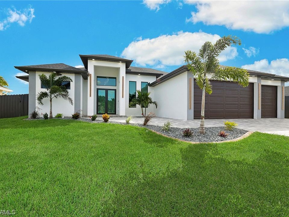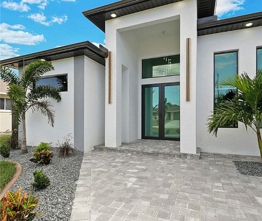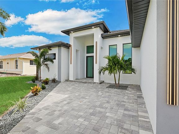 Luxurious Modern!!!! Home located in Cape Coral closes to Matlacha , New Construction , CO READY TO MOVE IN and loaded with every imaginable upgrade. Featuring 4 Bedrooms plus a den 3 Bathrooms and a 3 Car Garage with an open floor-plan, designer coffered ceilings, plank tile floors throughout,. Stylish modern kitchen features , waterfall center island, custom contemporary cabinetry, and high-end appliances. Spacious family room with feature wall & fireplace complimented by detailed vaulted ceilings. Designer chandeliers, fans, squared LED lighting. The owners suite feels like a private retreat with tub style with walk-in shower, and vanities. Spacious bedrooms each with unique tray ceilings. South Exposure for sunsets & afternoon sunlight on the Resort Pool with a salt system and Spa, massive sun shelf for sunbathing, of LED lights in the pool, Full outdoor kitchen, set paver deck, , & extensive landscaping. BOATERS very close to Matlacha for wet & dry boat storage, boat rentals, restaurants, dining, event.