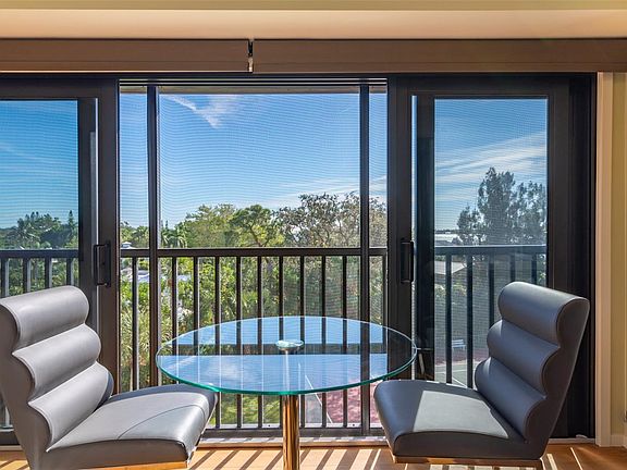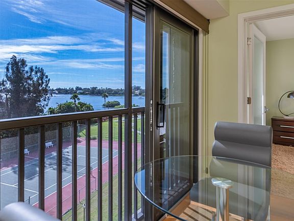 Boasting fourth-floor views of Little Sarasota Bay, this refined condominium affords rare, high-quality upgrades and splendid comfort in Castel del Mare at an incredible value. Offered turnkey furnished with a sophisticated furniture package, the coastal lifestyle is yours to immediately embrace. Once inside, natural light washes over the open-concept living room and kitchen, accentuated by cathedral ceilings for a bright and spacious atmosphere. The custom-designed kitchen is your first stop in the residence and a prize compared to the rest of the condominiums, featuring a plethora of cabinetry for storage, stainless appliances including a glass cooktop stove, tile backsplash, granite counters and a peninsula for casual dining. A wall of sliders open to a screened railing to allow the fresh tropical breezes in and overlook the grounds and shimmering bay views beyond. The master suite is a statement of relaxation with tons of natural light and vistas through a broad window and an en-suite bath. A guest bedroom and separate bath offer a desirable place for visitors to stay. The thoughtful upgrades are evident with Oak flooring, solid Birch interior doors, impact-resistant slider and more. Additionally provided with this condominium is a covered parking space with additional storage. Convenient access to Siesta Key, the local marina and a bounty of restaurants and shopping make this home the perfect retreat or new full-time way of life.