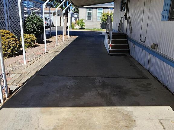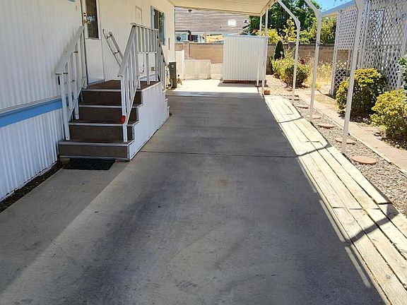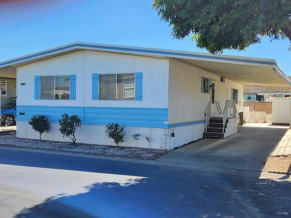 Nice home in Casa Del Rio Mobile Estates , sunny back yard with apple , avacado trees and 2 storage sheds . 2 bedroom 1 and 3/4 bath with newer fibreglass shower . Large covered front porch and long carport for 2 cars . Formal LR/DR along with a family room opening up to the deck . Furnace replaced 2 years ago for better efficiency.