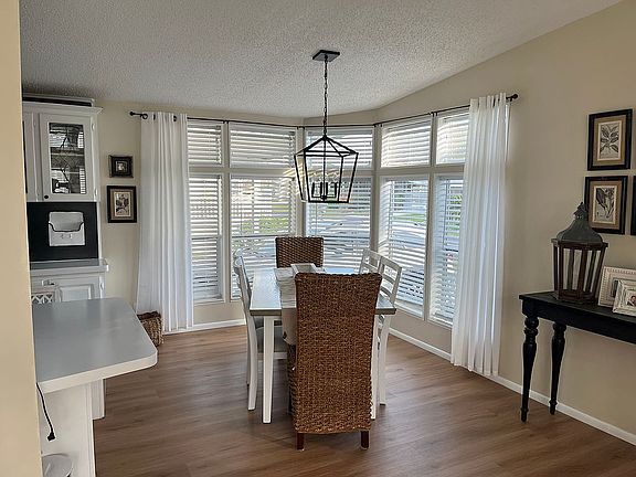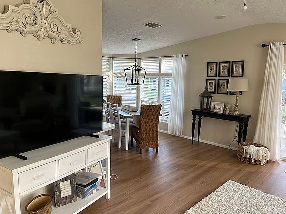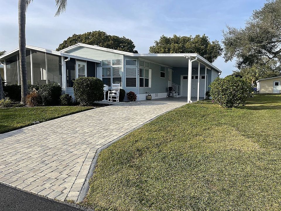 Beautiful 2 bedroom, 2 bath home in an active over 55 community of Foxwood Village. All interior has recently been painted with new flooring. Kitchen appliances less than 2 months old. Includes washer and dryer. Central air conditioning. Open front porch area overlooking palm trees. Long paver driveway with an attached one bay garage with double garage doors (front and back). Partially furnished (includes: living room couch and chair, dining room set, bedroom sets - queen and king). Lot rent includes a Spectrum TV and Internet Package subscription and garbage removal.