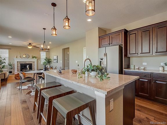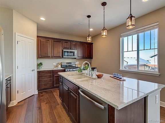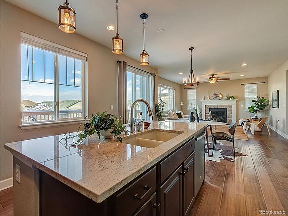 Gorgeous two story home with walk out basement and mountain views! The main floor features beautiful dark engineered flooring, dining room, family room with fireplace, powder bath, and gourmet kitchen. The kitchen has a huge island, granite countertops, stainless steel appliances, pantry, and space for an additional table. Upstairs you will find the luxurious primary suite with massive walk in closet, two additional bedrooms, secondary full bath, laundry area, and loft area great for play area or home office. Unfinished walk out basement with rough in for bathroom. 3 car attached garage. Beautiful landscaping with garden beds and lush grass, covered front porch and back patio, plus a deck with stunning view of the mountains. Updated lighting throughout. 25 minutes to Downtown Denver, 15 minutes to the airport, close to parks and open space! Pictures will be uploaded 11/16.