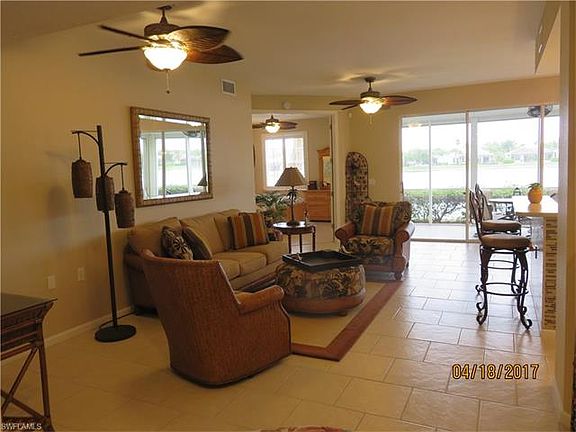 This bright and airy, open concept, first floor carriage home is located in the secluded community of Coco Bay within the gates of Kelly Greens Country Club. It has two bedrooms, two baths, den and a TWO CAR GARAGE. The large, lake front lanai has electric shutters and beautiful sunrises. The upgrades are numerous and include a recently remodeled kitchen with solid surface countertops, glass backsplash, top of the line stainless steel appliances, eat in bar area and plantation shutters throughout. Tile in the living areas and bamboo flooring in the bedrooms and den. Also included are decorator ceiling fans and light fixtures. Close to Sanibel and Fort Myers beaches, shopping and many restaurants nearby, this is an ideal location,