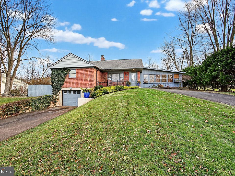 Step inside this raised ranch and discover a unique floor plan with thoughtful spaces throughout. The living room offers a warm welcome with a wood burning fireplace and extended brick hearth. Just off this room is access to a walk up attic that spans the entire footprint of the home and provides an impressive amount of floored storage. The dining room features built in shelves and a convenient buffet. The kitchen includes a breakfast bar with three stools, a large farmhouse sink, pantry closet, built-in shelving, ample cabinet space, an electric range, and a dishwasher. French doors from the kitchen open into one of the highlights of the home, a bright three season room filled with natural light from its walls of windows, along with a propane gas stove and a ceiling fan. This inviting space connects to the private, tree lined backyard and a large concrete patio that extends as a walkway along the back of the house. A hallway off the kitchen leads to the half bath and a separate door that closes off the full bathroom and first bedroom. The first bedroom features two generous closets with built-in shelves. The second bedroom is accessed directly from the living room. The lower level offers versatility with a finished office space that provides direct access to the oversized garage, complete with a tool bench. The unfinished portion of the basement includes the washer and dryer, workshop space, built in shelving, and a freezer. Additional highlights include central air, radiator heat, a newer roof that is approximately ten years old, and a newer furnace and oil tank installed in 2021. The washer, dryer, refrigerator, kitchen stools, and basement freezer are all included in the sale. The street feels tucked away like a well-kept secret, yet it is conveniently close to shopping, restaurants, and services and is located in the North Penn School District.