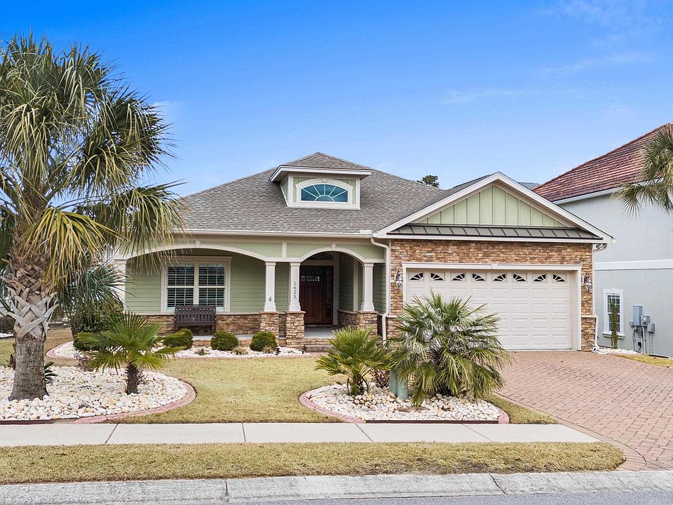 Beautiful 3 bedroom, 2 bath, single-level Craftsman home in Sunset Harbour, a highly desirable North Myrtle Beach waterway community with natural gas, sidewalks, boat ramp, day docks, onsite boat & RV storage, and a large community clubhouse and outdoor pool on the waterway. Built in 2016, this custom home was constructed with 2x6 exterior walls, Hardie board siding (concrete fiber), beautiful front stacked stone, architectural shingles and accented with a wide paver driveway and sidewalk to the covered front porch. This incredible curb appeal is enhanced by palm trees and CurbScaped beds with large river rocks. The elegant front wooden door with glass embellishments opens to the foyer with 12’ tray ceiling, crown molding and wainscoting. Throughout the house there are smooth ceilings, heavy crown molding, wide window & door trim work, and sound system. Entire interior was painted in 2023 including the baseboards, molding and trim. New Coretec® wide plank LVP flooring (2023) throughout except for tile in the bathrooms and laundry room. Home also features all new light fixtures and plantation shutters (2024). The 23’8 x 16’ Family room boasts 12’ coffered ceilings, gas-log fireplace with granite hearth and stone surround, and French doors to EZ Breeze® enclosed three-season back porch. Dining area has chair railing and a tray ceiling with molding and ambient lighting. The kitchen boasts tall, staggered cabinets with top molding and under cabinet lighting, granite countertops with undermount double sink, breakfast bar with 2 pendant lights, 4 recessed lights and stainless steel appliances: gas Samsung range with microwave above, LG refrigerator (2024), and ultra-quiet Bosch dishwasher (2024). Just off the kitchen is the laundry room with side-by-side washer & dryer, above shelving/cabinets, diagonal floor tiles, and a large pantry. All appliances convey. The Primary bedroom suite has a double tray ceiling with molding and ambient lighting, a large walk-in closet with a pocket door and custom shelving, ceiling fan, granite countertop vanity with double sinks, linen/storage cabinet, private water closet with comfort height toilet, new tile floor (2023), and large walk-in shower tiled from floor to ceiling with transom window, bench, & 2 shower heads. Both guest bedrooms have ceiling fans and custom closet shelving while the guest bathroom was totally renovated in 2024 with new quartz countertop, plumbing & light fixtures, and a tiled shower with glass slides. Relax on the 3 season back porch with painted floor, 2 ceiling fans and a new EZ Breeze® window and screen system or entertain on the outside 33’ paver patio with gas grill hookup. Backyard is fenced and has CurbScape® beds and tall trees with dense foliage to provide privacy. Irrigation system is all around property. Strand termite warranty is transferrable and good until 2030. Attached 2 car garage has a high-wind resistant door and extra overhead shelving. Owners are allowed motorcycles, golf carts and a maximum of 3 household pets. Sunset Harbour’s amazing amenities include the waterway front clubhouse with kitchen, outdoor pool, day docks and private community boat ramp. The onsite RV and boat storage lot currently has space available (subject to change) and does not have a storage fee for owners. Come see this beautiful home in the well-established subdivision of Sunset Harbour that is so close to everything North Myrtle Beach has to offer: shopping, restaurants, entertainment, shag dance clubs, and don’t forget the amazing Intracoastal Waterway and sandy beaches of the Atlantic Ocean!