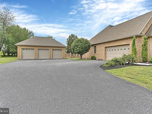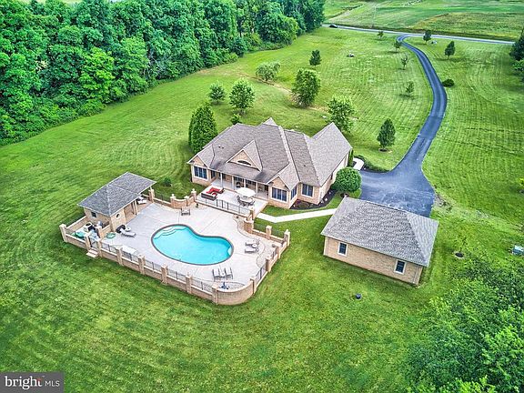 Absolutely gorgeous custom built brick one story home on 6.75 acres. Entertaining is a delight with the heated in-ground concrete salt water pool. The brick pool house has a kitchenette with granite tops and a bath. A herringbone patterned patio and covered back porch with columns provide space for guests. The pool/patio area is fenced with decorative brick and aluminum railings. This home has the open floor plan you've been dreaming off. A great room with a soaring cathedral ceiling, The dining room has 10 ft. ceilings & columns. The U shaped island separates the great room from the kitchen. Granite counters, custom cherry cabinetry, stainless appliances and a cozy breakfast nook overlooking the pool. The master bedroom suite has a wonderful sunlit sitting area with access to the pool, a tray ceiling, 2 walk-in closets and a luxurious master bath with a whirlpool tub and tile floors. A second master suite on the opposite side of the house also has its own bath and a window seat overlooking the pool area. The third bedroom is being used as an office. The hall bath is right next door. A convenient main level laundry/mud room with built-in cabinetry is located between the garage and the kitchen. 9 foot ceilings and hardwood and tile floors are found throughout the home. The interior doors are solid pine. The Anderson windows are tinted in the rear of the home. 3 zone propane fired hot water baseboard heat provides a nice even heat throughout the home. Central air, security system & central vac. The large lower level family room/man cave with a full bath provides space for the whole family and your friends to gather. Plenty of storage. 2 car attached garage with operator in addition to a newer 3 car detached brick garage with oversized garage doors and operators. The adorable playhouse is included. 6.75 acres provides plenty of space to enjoy all of those outdoor activities. This wonderful property is located less than 2 miles from the Maryland line for an easy commute!