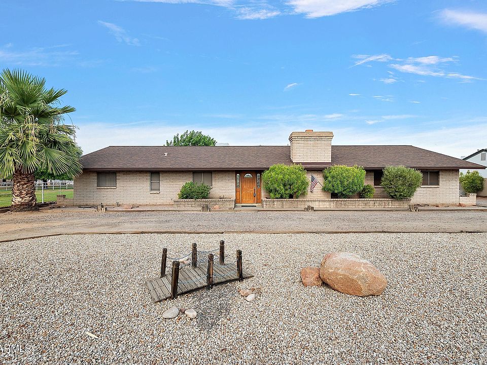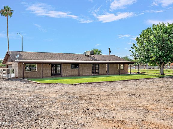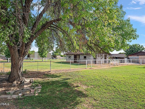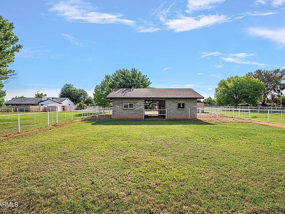 Discover the perfect blend of urban convenience and equestrian living in this fully fenced 1.1 acre, slump block home. Offering 3 bedroom 2 bath, this property is idea for horse enthusiasts. Bring your toys, cars or RV. No Hoa. Barn 3 horse stalls with runs, grass pastures with irrigation, Shop that allows for 3 cars. Main House garage is a 2 car . The Roof on all buildings were replaced 2020. Sold As is.