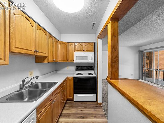 Charming 1 Bedroom Ground Floor Condo Available! Freshly painted ready for immediate move in! Large living/dining room with walk out to private covered patio and access to two storage closets! Kitchen features LVP flooring and pass through counter bar! Bedroom includes two closets and attached bathroom with tub/shower and newer flooring! Laundry facilities on site, along with clubhouse and pool! One covered carport space and plenty of additional parking throughout the community available. HOA covers water/trash/snow removal. Enjoy low maintenance living in the heart of Colorado Springs!