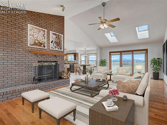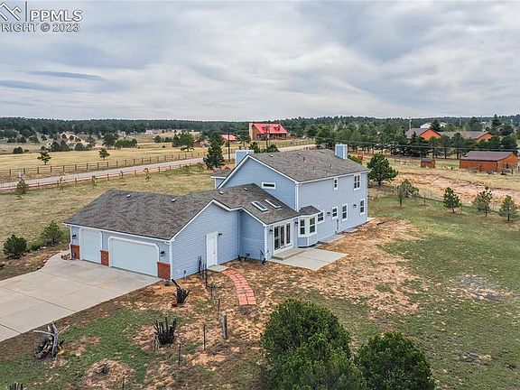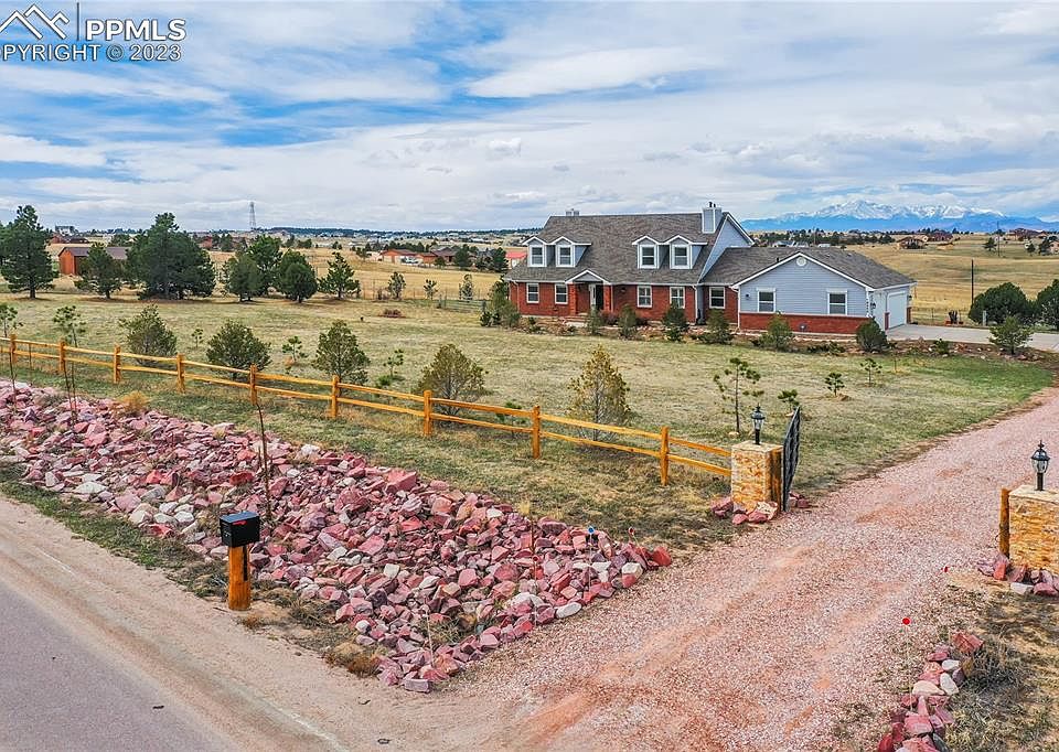 Exceptional Black Forest home with sweeping Pikes Peak and full mountain range views, almost 4,700 sq ft, six bedrooms w/ two primary suites perfect for multi-generational living and a 7 car garage on 5 acres with trees and meadow. The property is fully fenced, zoned for horses, outbuildings and RV's. New carpet and paint throughout. All paved roads to the property and partial concrete driveway. Sought after Black Forest location with great access to Highway 83 and I-25. Quick commute to Colorado Springs or Denver. Award winning School District 38. Gorgeous mountain views from the entire west side of the home. Grand 2-story entry with marble floors. Open kitchen w/ slab granite counters, bay window, stainless appliances, gas cook-top, island, pantry and an abundance of cabinets. Energy efficient design with 2x6 construction, high quality windows, vaulted ceilings, skylights, brick and vinyl sided exterior. Main level primary suite w/ hardwood floors, private walk-out, a remodeled 5 piece bath w/ soaking tub, double vanity w/ slab granite counters and shower w/ glass surround. Main level laundry. The upper level primary suite features a sitting area, charming window dormers, a 4-piece bath and walk-in closet. Spacious family room w/ hardwood floors, gas fireplace w/ full brick surround, vaulted ceilings and a walk-out. Formal dining with large window and hardwood floors. Upper level loft with tons of natural bright light. Fully finished basement w/ 3 additional bedrooms, large family room and bath. Beautiful landscaping w/ a variety of trees and huge landscape boulders. 3 car attached garage and 4 car detached garage (32x48). Close to the highly regarded golf course at Flying Horse North. Newer Trane high efficiency furnace. New roof being installed. Virtual tour available. Some photos have been virtually staged.