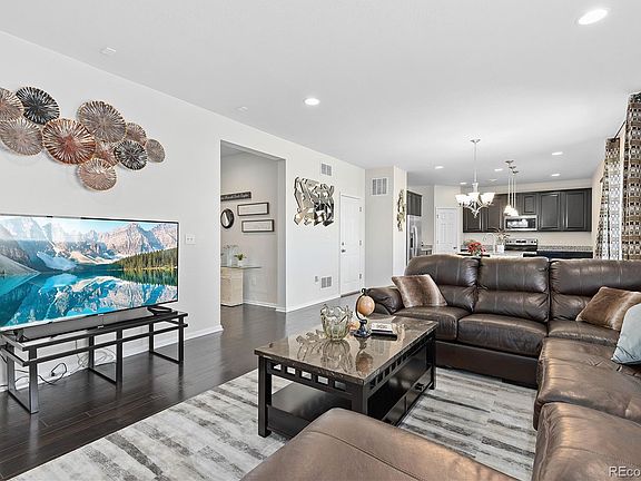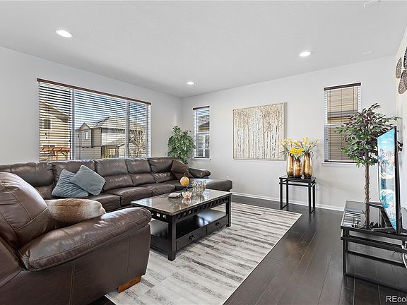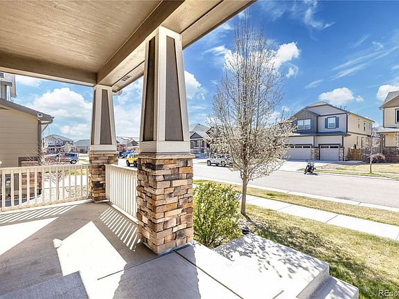 Beautifully crafted home in Buckley Ranch! This prime location is less than a block from Fronterra Park and moments from Second Creek Open Space with endless trails. The upgraded front elevation immediately catches the eye, featuring distinctive craftsman-style columns and robust stone accents, creating a striking curb appeal. Step inside to discover a seamless flow of rich hardwood flooring throughout the main level, complemented by high ceilings and recessed lighting that enhance the home’s spacious feel. The open floor plan seamlessly merges the living room, dining area, and kitchen, ideal for family gatherings and entertainment. The kitchen flaunts upgraded cabinetry adorned with crown molding, sleek granite countertops, and stainless steel appliances. The main floor flex space is perfect for setting up a home office or study area. The black wrought iron stairway, featuring elegant twist basket weave spindles, leads you upstairs. Four bedrooms offer ample living space, including the spacious primary suite. This retreat boasts a large, comfortable layout with an ensuite bathroom featuring dual sinks and a walk-in closet. Convenience is key with an upper-level laundry room. Outdoors, the large backyard is equipped with lighting and a pre-run gas line for a BBQ grill, setting the stage for memorable outdoor gatherings. This property also features a home technology package, home theater pre-wiring, efficient HVAC system w/ HE furnace and mechanically controlled ventilation, and Energy Star Qualified Low-E windows. Located near top-rated schools, parks, shopping, and dining, and with easy access to DIA within a 15-20 minute drive, this home offers both tranquility and convenience!