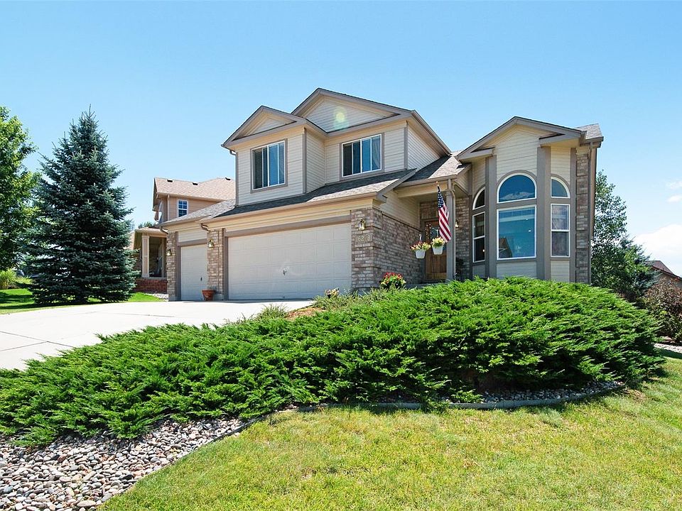 This is a gorgeous home, and is lovingly maintained! Beautiful wood tones, hardwood floors, vaulted ceilings, great condition! Open kitchen with plenty of cabinets, tiled backsplash, recessed can lights, tile floor, and pantry. Dining room is adjacent to the kitchen and walks out to the large wood deck. Master has extended size option, great views, walk-in closet, private master bath with a double vanity and garden tub. Great views from all bedrooms! Basement is ready to finish - upgraded insulation with bathroom rough-in. CAT 5 wiring throughout. Gorgeous landscaping with a fenced back yard. Perfect location - one block to Bear Creek Elementary, 5 minutes to shopping, dining, Home Depot, Walmart, and grocery. It takes less than 5 minutes to get to I-25, and you can be at the AFA in 10 minutes, Castle Rock in 30 minutes, and Denver in less than an hour. Near hiking, biking trails, Fox Run Park, medical services, and more.