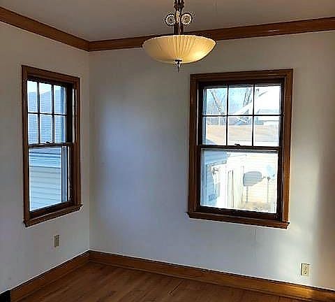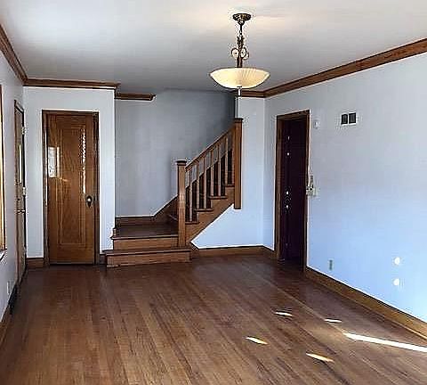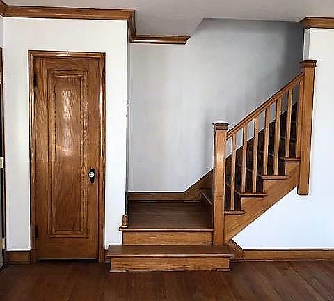 This home has remarkable wood work from the wood floors, woodwork, doors and stairs to the crown molding. Basement is open with taller ceilings. The roof on the house and barn are new. The barn has a two car garage door on it. The yard is fenced in. The kitchen has custom built (1940) cabinets that are painted. The upstairs has previous (to the new roof) water damage to the ceilings and are in need of repair.This home is conveniently located across the street from an elementary school. The siding and windows appear to be in good condition. This house would make a nice home.