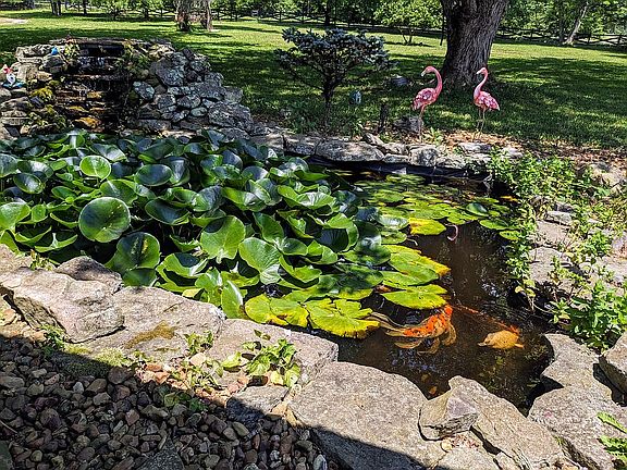 Enjoy sitting out front listening to the water flowing and watching the koi fish in their pond or out back by the natural gas fire pit.