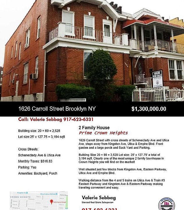 1626 Carroll Street with cross streets of Schenectady Ave and Utica Ave, steps away from Kingston Ave, Utica & Empire Blvd. Lot size: 25' x 127.75' a total of 3,194 sqft. Front garden and a large porch and Back Yard and Parking. Clearly one of the most unique 2 family townhouse in Crown Heights you will find on the market! Well situated just few blocks from Kingston Ave, Eastern Parkway, Utica Ave and Empire Blvd. Walking distance from the 4 and 5 trains on Utica Ave & Train #3 Eastern Parkway and Kingston Ave & Eastern Parkway making traveling convenient and easy.