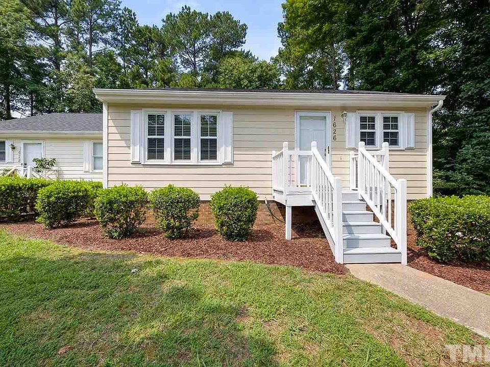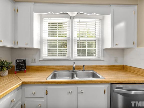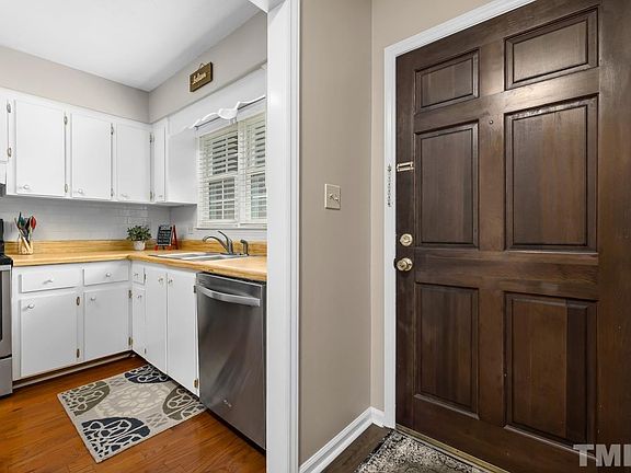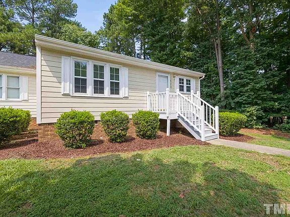 LOCATION, LOCATION, LOCATION! End unit, one level townhome that Lives beautifully & is simply charming! Well maintained 2 bedroom/ 2 full bath with vaulted ceilings & skylights, fireplace, dining space and adorable kitchen. Spacious bedroom with ensuite bath and private entry to large back deck. No carpet. Roof & siding all updated in recent years. Location just off 440 w/ great connectivity to entire Triangle! Minutes to Lake Johnson and Crossroads Plaza! Home Warranty included! Solid investment. HURRY!