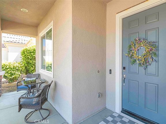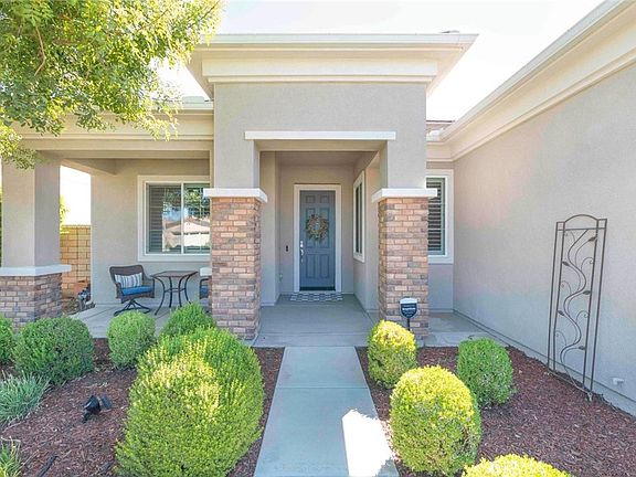 Welcome to the 55+ Solera Diamond Valley Community by Del Webb. This stunning El Dorado model features 2 bedrooms, 2 1/2 baths, 2,230 Sqft., a den, and formal dining room. The professionally landscaped property boasts a sweeping green lawn complemented by a well-defined shrub border, drought-tolerant trees, and bushes. Faux brick embellishments grace the pillars, leading to a grand entrance with a shaded front porch sitting area and covered entryway. Recent upgrades include trending color schemes, enhanced wood-like plank flooring, and rarely found exquisite white cabinetry. Plantation shutters adorn the majority of windows. Notable features comprise lofty 10-foot ceilings, diagonally set tiles, and ceiling fans. The advanced energy package includes garage insulation, upgraded ceiling and wall insulation, a radiant roof barrier, a 14-seer AC system, a tankless water heater, and insulated garage doors. The upgraded kitchen seamlessly connects to the open-concept floor plan, showcasing refined white cabinetry with contrasting hardware, white and gray quartz countertops with a full backsplash, stainless steel appliances, an expansive breakfast bar, a breakfast nook, pantry, center island, and built-in amenities including a recycle bin and under-cabinet lighting. The great room features an inviting fireplace and an 8-foot slider to the rear yard. The versatile dining room can be formal or casual, while the powder room exudes elegance with two-tone paint, chair rail, designer shelf, and mirror. The spacious primary bedroom boasts an ensuite bath with dual sinks, separate step-in shower, and soaking tub and mirrored wardrobe door to the large walk-in closet. The secondary bath offers ample storage and a tub-shower combination. The laundry room includes a utility sink, large folding countertop, and upgraded upper and lower white cabinets. The home's model includes an oversized garage, perfect for a golf cart, workshop, or extra storage. The backyard oasis features a California patio with a ceiling fan, complemented by brick hardscaping, concrete border for clean lines, highlighted by shrubs and concrete and vinyl fencing. Crisp concrete borders define clean lines, and a low-maintenance landscape includes a serene green scape wall. Leased solar panels significantly reduce electric bills. The community center offers a workout center, library, billiard tables, conference rooms, theater, indoor and outdoor pools, Bocce ball, tennis, and pickleball courts.