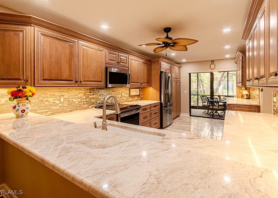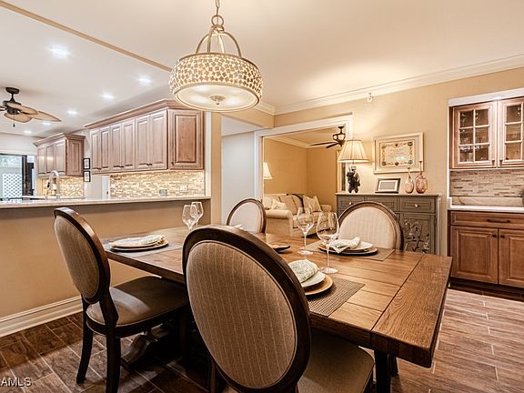 BEST BUY IN KELLY GREENS!!! $42K in high end furniture. You'll know from the moment you walk through the door that this is not your average condo. This one is high end with all the bells and whistles. The kitchen is light, bright, and open with raised ceiling and 11 recessed lights. Korner king cabinets on both sides providing easy access with drawers and a lift up for that heavy mixer. Champagne toast pencil tile backsplash, LED under counter lights, Taj Mahal Quartzite countertops, high end GE Profile stainless steel appliances (Induction range, refrigerator, silent dishwasher, microwave, and under counter wine refrigerator). Kitchen floor is beautiful travertine. Crown molding in all rooms except the entry. Frontload clothes washer and dryer and built in counter and cabinets above them. Master bedroom with bay window, his and her closets with organizers. Toe mold lights in both baths. Den with pocket doors. Both lanais are enclosed with high end acrylic sliders. Whole house commercial surge protector. When you tour this condo, no other will compare and at an affordable price of $339,000. One of a kind!! Don't miss out on this one.