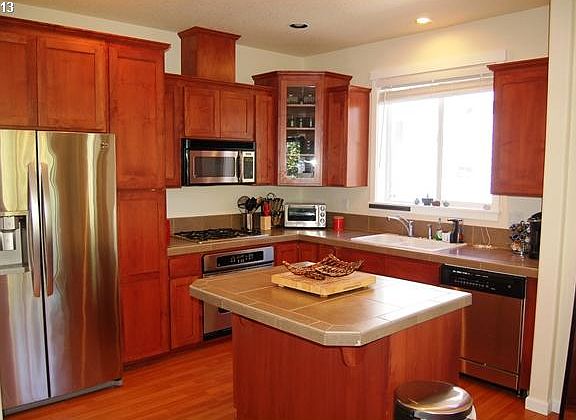 Fantastic end-unit townhouse in great condition adjacent to peaceful treed lot-great setting! Covered porch & common area courtyard in front. Laminate floors on main level. Great kitchen with tile counters, island, stainless steel appls & gas cooktop. Dining area w/ bar counter/cabinet. Living room w/ gas fireplace. All bedrooms are vaulted. Integrated cabling system installed. 2 car garage below unit. Great deal-this one will go fast!