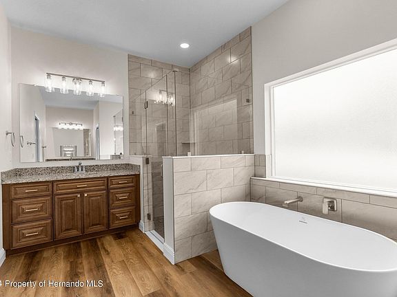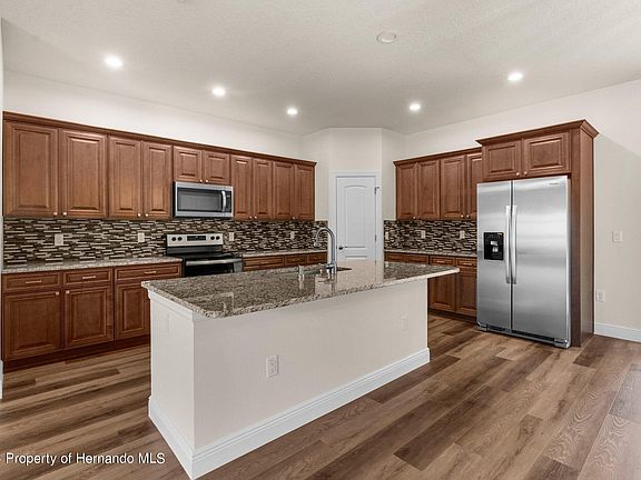 BRAND NEW LUXURY HOME without the year long wait!! Signature SPA-LIKE Master bathroom and Laundry Room will impress you!! MOVE-IN READY!! PAVED ROAD! Builder's Warranty!! The only thing you need to do is decorate to make it your own!! Offering 3 bedrooms + 2.5 bathrooms + 2 car garage nestled on over a 1/2 acre in a great location close to shopping and zoned for the county's newest schools (K-12)! This Craftsman-style home with country appeal and stone accents - offers you that southern country feeling! NO FLOOD. NO HOA! No CDD!! OPEN FLOOR PLAN!! HIGH CEILINGS!! 1,949 sq ft living space; 2,643 total. In the rear of the lot, beyond the backyard, it was left wooded for that privacy everyone desires - no rear neighbors to look at and no one to look at you! The stone entry way & front door welcomes you and your guests into the grand center of the home with large open great room, island-style kitchen and dining room all with 10' ceilings! The high ceilings and open floor plan make this home feel large, spacious, and comfortable! Every inch of this custom home is upgraded and attention was paid to every inch and every detail including designer faucets and lighting, upgraded baseboards, upgraded windows/sliders, and continuous Luxury Vinyl Plank flooring throughout the entire home (no carpet)! The upgraded kitchen offers stunning granite countertops with the modern large, single-level island with breakfast bar big enough for the whole family! Warm real wood upgraded 42' soft-close cabinets with a stunning backsplash for that finished luxury look and feel. New stainless steal appliances! Generous-sized pantry! The builder's impressive 'Signature Laundry Room' in this custom home will make this your favorite place in the home - you'll take pleasure and pride in organizing your home and family from this amazing space! It offers matching granite counter tops and under-mount sink, upgraded real wood cabinets (with upper cabinets too) with extra countertop and cabinet storage space that RIVALS the kitchen! The home has a split floor plan offering privacy to the owner's suite with large ensuite bathroom! Double doors open up into the private master bedroom with a high tray ceiling and two large walk-in closets! The ensuite bathroom is a SPA RETREAT in itself with a large stand-alone, modern soaking tub, separate over-sized, floor-to-ceiling tiled walk-in shower and designer shower head and frameless glass door, dual granite vanities and dual sinks, matching real wood upgraded cabinets with framed mirrors, designer faucets and lighting, and a separate toilet room for privacy! There is a half bath off the great room for your guests which is also conveniently placed by the door to the garage for the quick access when outside! On the opposite side of the home are the 2 additional generously-sized bedrooms with second full bathroom. Sip your coffee on your large back covered patio in the mornings! Multi-zoned sprinkler system & landscaping! Builder's Warranty provided. Quality Custom Builder.***Other spec homes available call for details. Zoned for the county's newest schools...Winding Waters K-8 and Weeki Wachee High School. Minutes from shopping, restaurants, movies, schools, Buccaneer Bay Water Park, kayaking the crystal clear Weeki Wachee River, sunsets at Pine Island, boating, fishing, swimming w/the manatees. 1 hr to Tampa & TOP US BEACHES!
