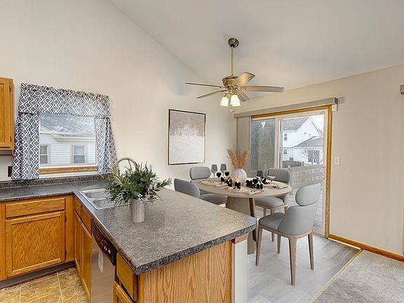 Rare Find - Cozy & Clean 1600Sqft Ranch 3 min from I90 in Belvidere!! You'll love the open-concept floorplan with vaulted ceilings and main floor laundry. The kitchen includes all appliances, newer stove and fridge, washer and dryer will stay also. Entertaining is made easy in this home with eat-in table space, a breakfast bar, and formal dining room. Dining room could also be a nice-sized home office space. Main bedroom has dedicated bath and walk-in closet, good sized 2nd bedroom and 2nd full bath on main floor. Lower Level offers 3rd bedroom w/ egress, a half bath, rec room/family room and a huge crawl space for all your storage needs!! You'll enjoy many BBQ's and summer evenings on the large deck overlooking a fully fenced yard! Walking distance to elementary, middle, and high school. HSA Home Warranty included. Property will be sold as-is to settle estate. TVs on living room wall and primary bedroom wall will stay with the house.