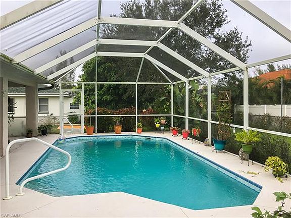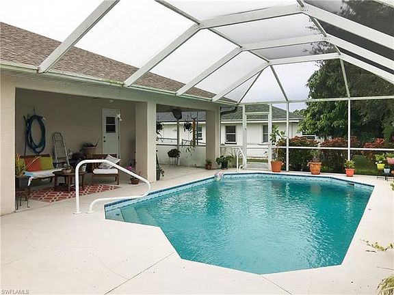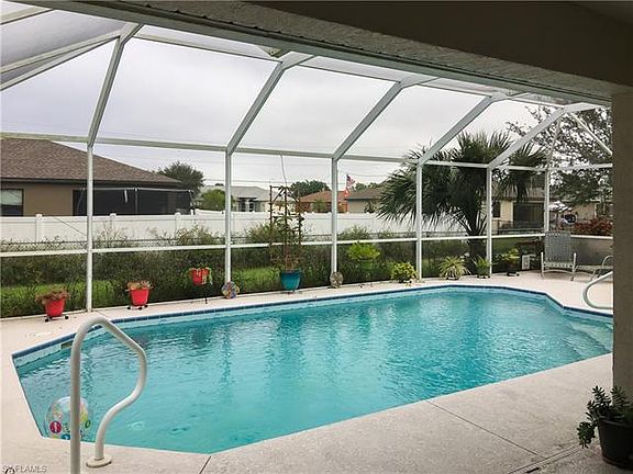 This home sits on 3 lots and is a spacious 4 bedroom pool home with over 1700 sq.ft and large entertaining deck. Fenced yard, 2 car garage Great room oversees the large spacious kitchen with white appliances, and separate area for dining. kitchen has large L shaped island can be used as breakfast bar.. White tile floors and laminate in all other rooms, vaulted ceiling. 4 bedroom is large and has sliders to pool area(no closet)Master bedroom has large walk in closet with nice sized bathroom. Buyer to assume Cape Coral Utilities assessments of approximately $235/moth