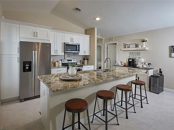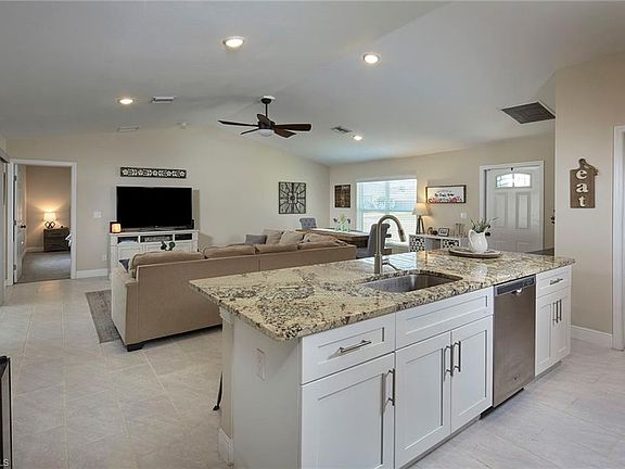 This gorgeous, former model home built in 2018 is in pristine condition and located in desirable Southwest Cape Coral. This Eagle II model has an open floor plan with four bedrooms, two baths and features vaulted ceilings, tile throughout the living areas, soft-touch 36-inch white cabinetry, stainless steel appliances, granite countertops, a huge kitchen island, laundry room in residence, hurricane shutters, paver driveway and automatic garage door opener. The master bedroom en suite has a large walk-in closet, dual sinks and spacious shower. This immaculate home is located on a triple lot with a gigantic backyard, 6-foot white vinyl privacy fence, screened-in lanai and plenty of room for a pool or boat. No HOA fees. Call me for a private showing.