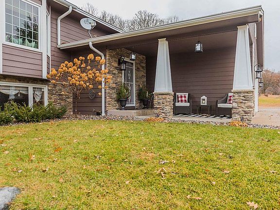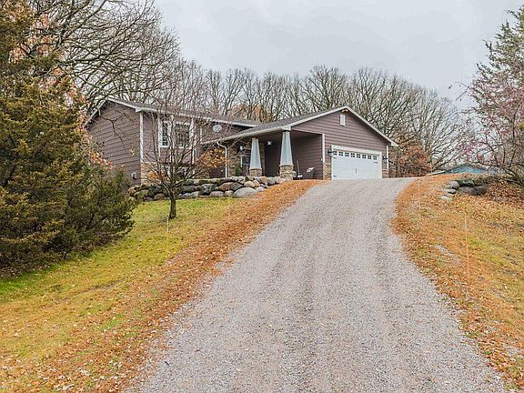 Beautiful secluded setting and views on 2.71 acres~Tree lined driveway leads to the attractive front entryway with a covered porch and pillars~The home has been remodeled to include a custom kitchen with antiqued cabinets, stainless appliances & center island~The dining area is spacious & leads out to a 2 tiered deck and wooded back yard~There are hardwood floors throughout these areas~The living room features a window seat & bay window that was added during the remodeling~The main bath was extensively remodeled to include a ceramic bath and floor, custom vanity and sink~There are two bedrooms that complete this level~The cozy lower level family room has tongue-n-groove wood walls & a walkout to the yard~A gas fireplace keeps you warm in the winter months~There are two additional bedrooms framed in on this level ready to be finished~ A 3/4 bath is installed but needs finishing touches~There is a separate 3 car garage and an attached 2 car~The roof & gutters were new in 2016~Rare find!