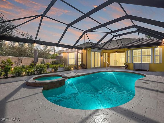 Welcome to Colonial Shores of Fort Myers. This stunning 2,338 ft home features 3 bedrooms and 2 bathrooms, along with a separate office, all situated on an oversized lot. For peace of mind, it also includes a two-year-old 38KW whole house generator powered by a 500 gallon underground propane tank ensuring everything runs smoothly during power loss. The home features several modern upgrades, a new cocoa brown roof, a Trane air conditioner equipped with an away app, a new pool pump, gutters, and soffits. Safety and security are paramount, with electric and manual hurricane shutters on all back sliders, as well as accordion shutters for the back and side windows. The property is beautifully illuminated with electric accent lighting, complemented by a Ring security system with spotlights. The three-car garage is another fantastic feature, complete with insulated doors, custom wall cabinets, and a sink for added convenience. Upon entering through the front door, you will notice the many features of this custom home. High ceilings and natural light greet you from the large open living room and dining area with sliders out to your pool area. The updated kitchen, with its white wood cabinets, stainless steel appliances, black quartz counters, marble backsplash, and breakfast bar and nook, is perfect for entertaining. The large master oasis, with its ensuite bath and walk-in closets, allows you the perfect retreat at the end of the day. Two other bedrooms and appointed bath on the opposite side of the home provide privacy for family or guests. The house was built in 2005 and showcases plantation shutters throughout. Additionally, the bedroom flooring is Calacatta gold honed marble, and the kitchen backsplash features marble as well.