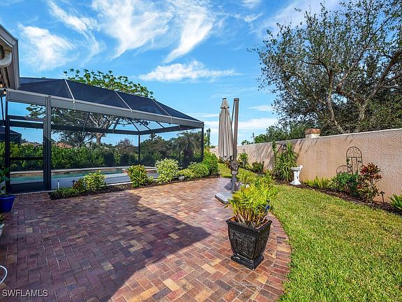 The property also boasts a large brick driveway, providing ample space for vehicles, as well as a charming side brick walkway that adds to its curb appeal. Located in a perfectly centralized area, this home offers easy access to the beautiful beaches of Sanibel and Fort Myers Beach, along with a variety of fabulous local restaurants and shopping options. One of the many highlights of this property is the oval-shaped propane-heated pool and spa, surrounded by an elegant ivory French pattern natural shell-stone travertine that remains cool your feet during those hot summer days. The clear view pool cage with hurricane screening enhances the outdoor experience, while an outdoor shower is conveniently available for rinsing off after beach outings. Additionally, the half-moon brick deck serves as a delightful spot for a fire pit or enjoying your morning coffee.