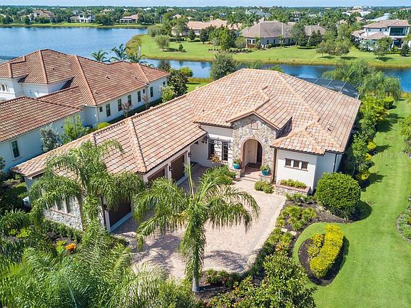 Beautifully sited in the prestigious Lake Club, this three-bedroom plus office and bonus room home boasts superior comfort with Tuscan details suited to today's luxury buyer. Soaring ceilings capped by rich wood beams and brick accents throughout, the home lives like a reimagined Italian villa along a magnificent lakefront. Enjoy an open floorplan that welcomes large gatherings with a seamless flow from a grand living room with surround sound and fireplace to the kitchen to the dining room and the expansive paver terrace beyond. The gourmet kitchen is full of delightful epicurean amenities to satisfy the family chef, including stainless steel appliances, pot filler over a six-burner stove, farmhouse sink, and stone countertops. Family and guests can congregate at the breakfast bar or the formal dining area with two chandeliers. Host outdoors on the fully screen enclosed lanai with heated saltwater pool and spa, full summer kitchen, multiple covered areas for dining, and a gas firepit. The Mediterranean narrative extends to all bedrooms but astounds in the master suite with sitting area and a spa-like bath featuring exposed brick detailing with opposing vanities, oversized walk-in shower, dual water closets, and soaking tub. Two additional bedrooms share a Jack-and-Jill bath. Additional features of note include a central vacuum system, home generator, and three-car garage with Tesla charging station. Located near A-rated schools and the best of Gulf Coast culture, The Lake Club is a premier, gated community with interconnecting lakes, a marvelously renovated Grand Clubhouse with two pools, billiards room, large fitness facility, and tennis courts.