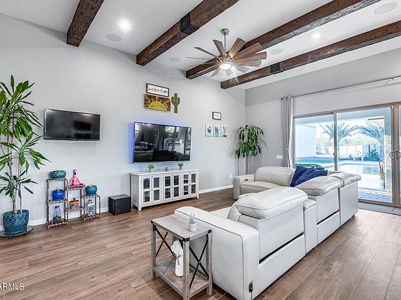 The gourmet kitchen is equipped with GE Profile appliances, a beverage center, and soft-close cabinets, illuminated by LED cabinet lighting. Entertain with ease in the great room with 12' ceilings enhanced by faux wood beams, and a 16' glass slider door that opens up to the resort style backyard.