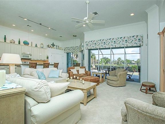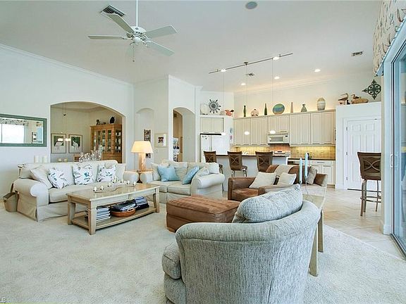 Great price on this very popular but seldom available 3 Car Garage Sussex model loaded with many extras as well as the most scenic water & golf course view in Crown Colony. The 3-bedroom/3-bath + den great room floor plan is accented by crown molding, cathedral ceilings, large reinforced screened lanai with AquaLink heated pool & spa, plantings for privacy and a pool bath with shower, protected by a reinforced windscreen. The kitchen features exquisite granite counters, extended high cabinets and diagonal ceramic tile with a lovely eat-in kitchen nook. The entire home has home theater surround sound, electrical dimmers, and an electrical surge protector. Front windows are protected with 3M Film Window Protection. New Xfinity fiber-optic high-speed cable with HDTV, DVR is included in the low quarterly fee, outside & lawn maintenance, and access to the heated community pool, tennis courts and fitness center. Included in the community is a private 18-hole championship golf course that is available BUT NOT MANDATORY. Crown Colony is a 24/7 guard gated patrolled community close to pristine Gulf beaches, fine dining, shopping SWFL International Airport and Lee County Health Park Center.